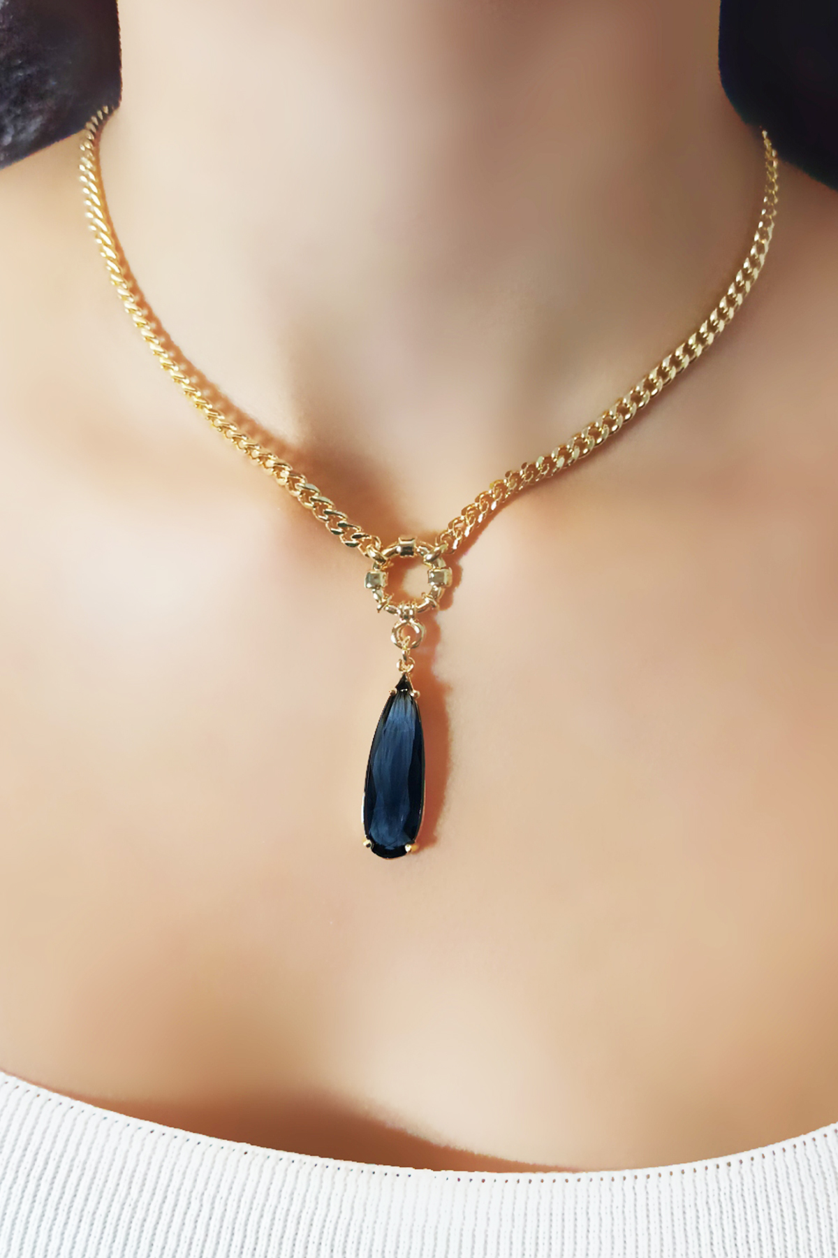 Göz alıcı tasarımıyla öne çıkan "Kadın Kararmayan Gold Özel Kesim Gece Mavisi Su Damlası Kolye", zarif ve şık bir stilin anahtar parçası olarak öne çıkıyor.