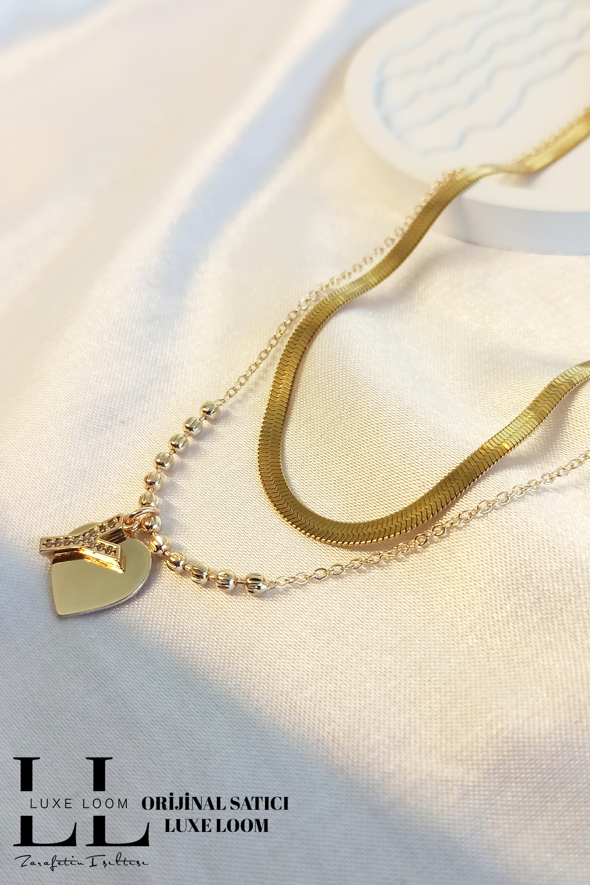 Modern kadınların stiline hitap eden bu kolye seti, İtalyan ezme tekniğiyle tasarlanmış gold renkli kolye ve zarif bir kalp detayına sahip çift katmanlı kolyeden oluşur
