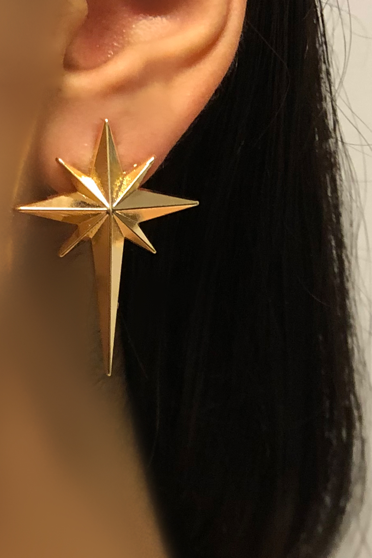 Altın rengi ve zarif kuzey yıldızı motifleriyle süslenmiş olan bu küpeler, modern ve şık bir görünüm sunar.