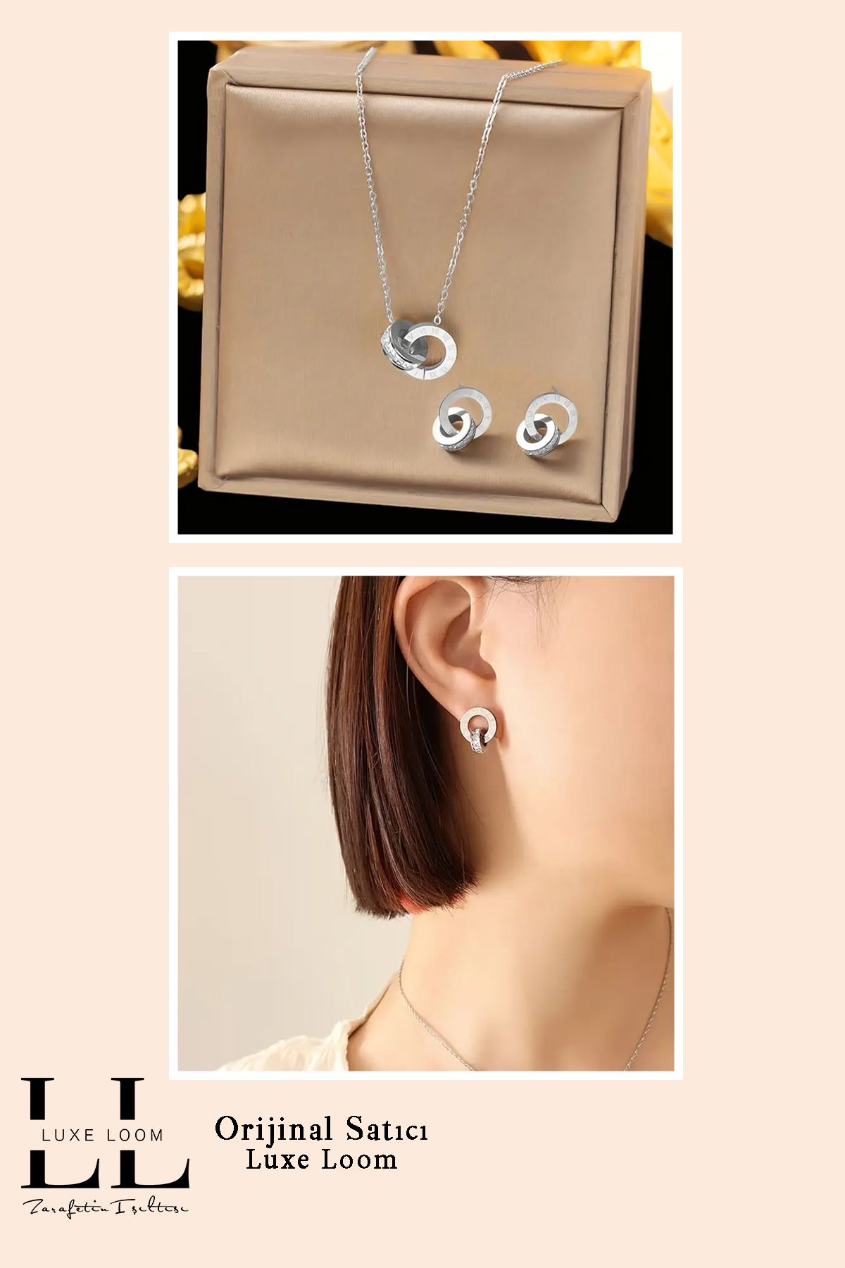 İki parçadan oluşan set; kolye ve küpelerden oluşur, kombinlerinizde uyumlu bir görünüm sağlar.