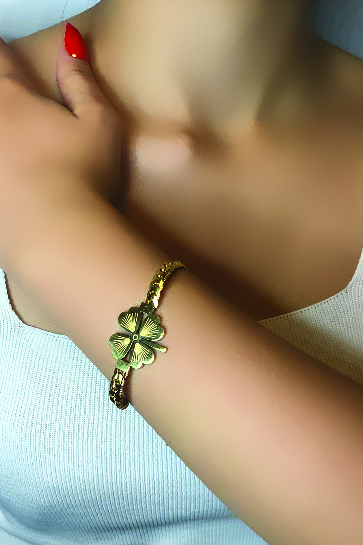 Altın rengiyle dikkat çeken bu bileklik, göz alıcı bir görünüm sunarken, yonca tasarımıyla da şans ve pozitif enerjiyi sembolize eder.